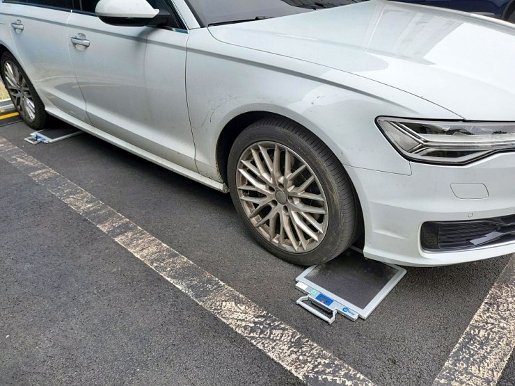 측정 모듈을 메인 구동축이 아닌 보조구동축 휠 중앙에 이와 같이 부착하고(아우디의 경우 뒷쪽), 주행 중 분실되지 않도록 스트레치 코드로 휠에 묶어서 눌러줍니다.