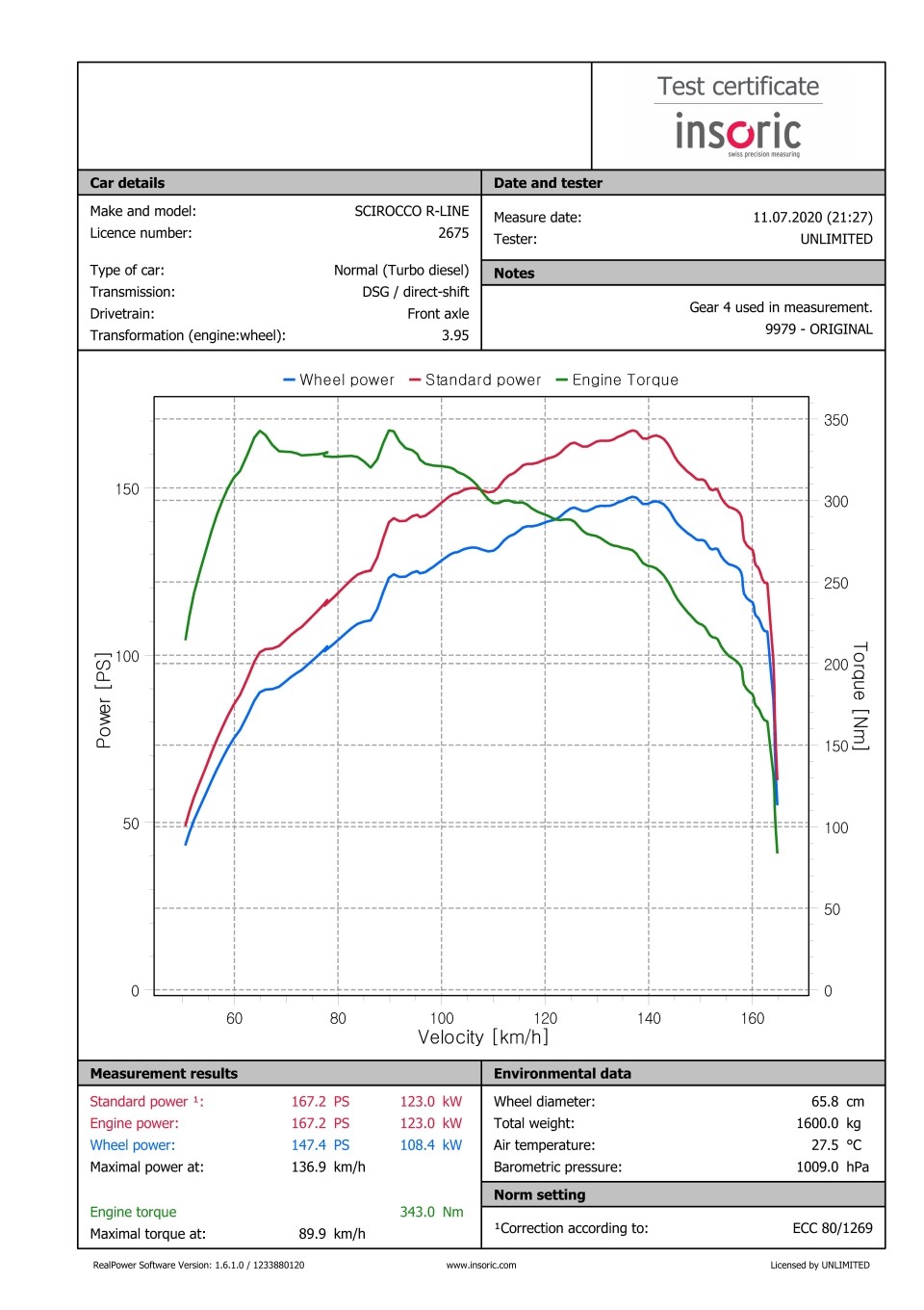 위 차량에 대해 순정 및 맵 이후 출력에 대해 로드 출력 측정 장비인 Insoric 으로 측정 했습니다. 이 장비 특성 상 실제보다 출력(휠마력)이 5% 정도는 낮게 나옵니다.