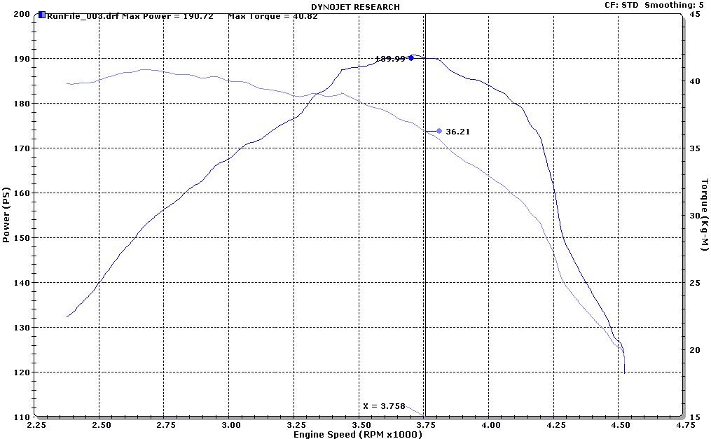 해당 데이터로 다이노 테스트한 데이터 입니다. 휠마력 상 190에 41토크 선으로 셋팅 됩니다.