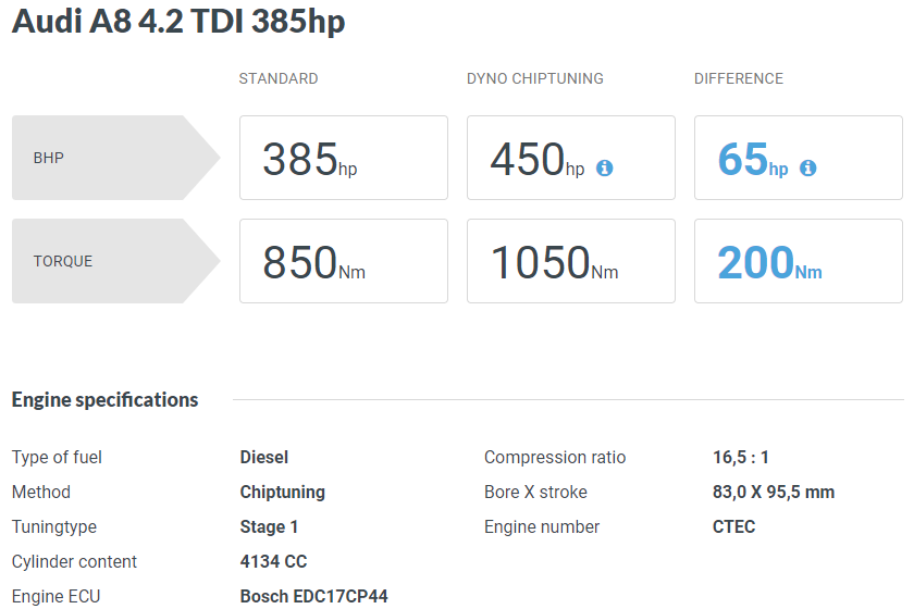 8기통 디젤 답게 기본 출력은 385마력 선으로 충분합니다만, 이 엔진을 채택하는 차량이 대체적으로 출력을 주로 꾀하는 차량이 아니기에 초반 가속이 조금 답답하게 느껴질 수 있습니다. 이는 엔진 출력 자체가 모자란 것이 아니기에 충분히 리맵 과정을 통해 개선이 될 수 있습니다.