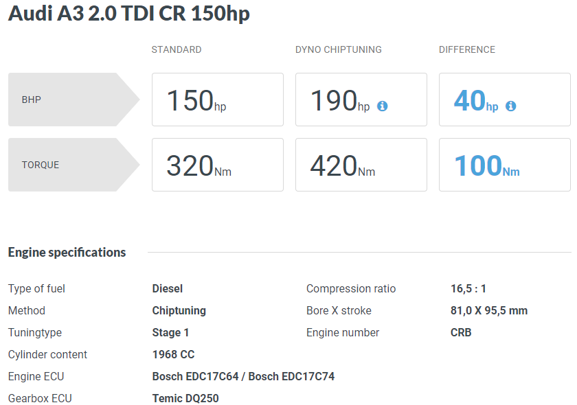 이 차량도 이전 차량과 유사하게 기본적인 데이터는 폭스바겐 골프와 다르지 않습니다. 따라서 출력 향상치도 유사합니다.