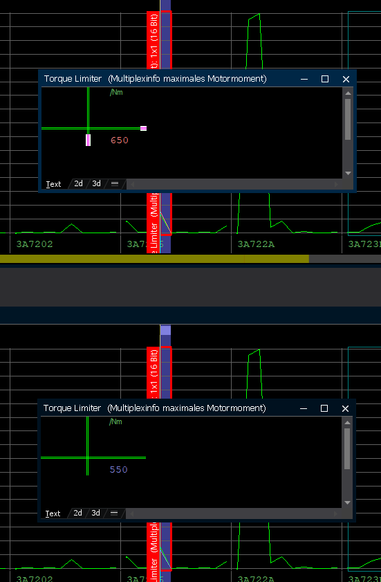 하단의 파란색이 오리지널, 빨간색이 수정한 데이터 입니다. 토크 리미터 550Nm을 650Nm으로 올려줍니다.