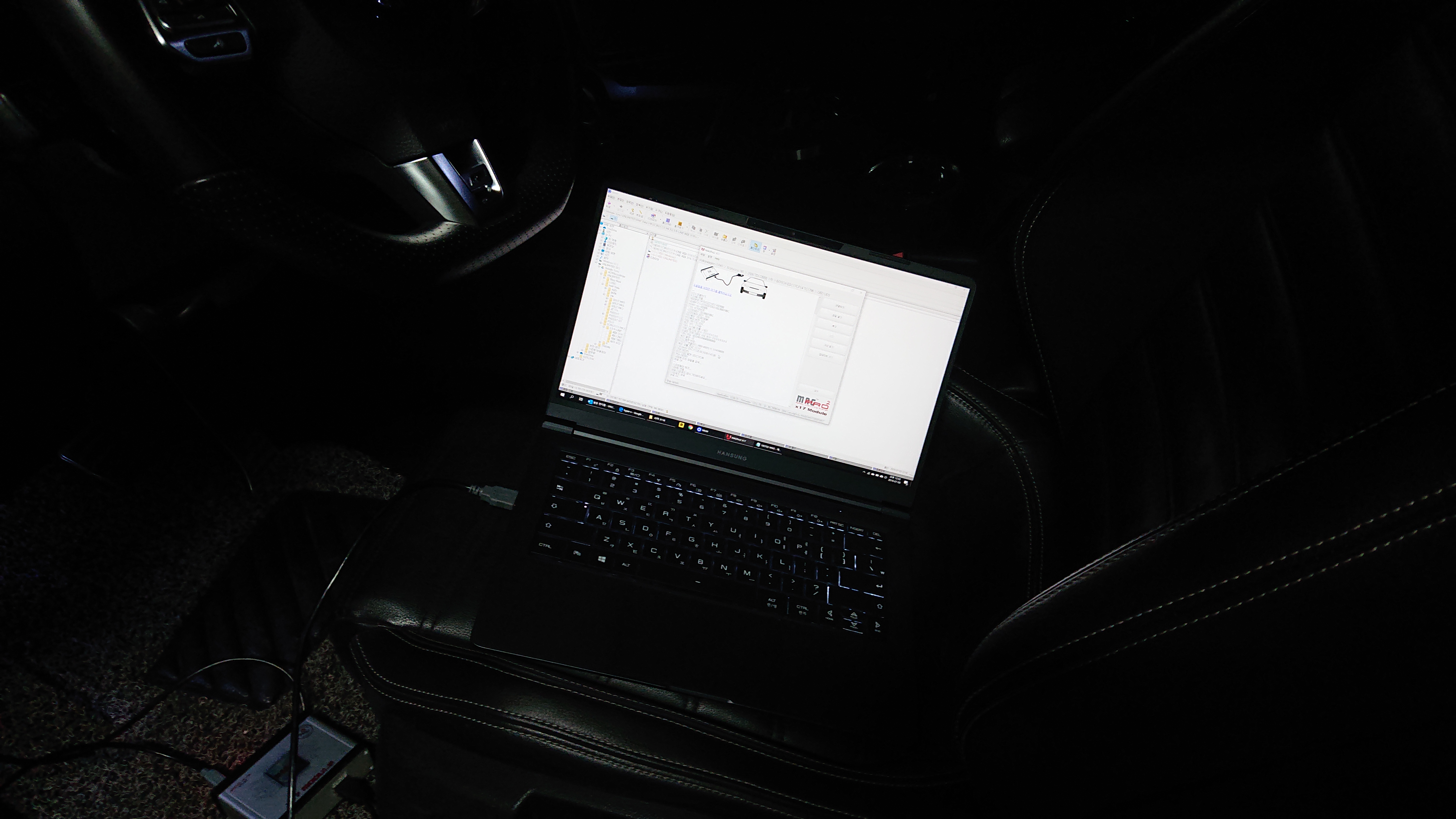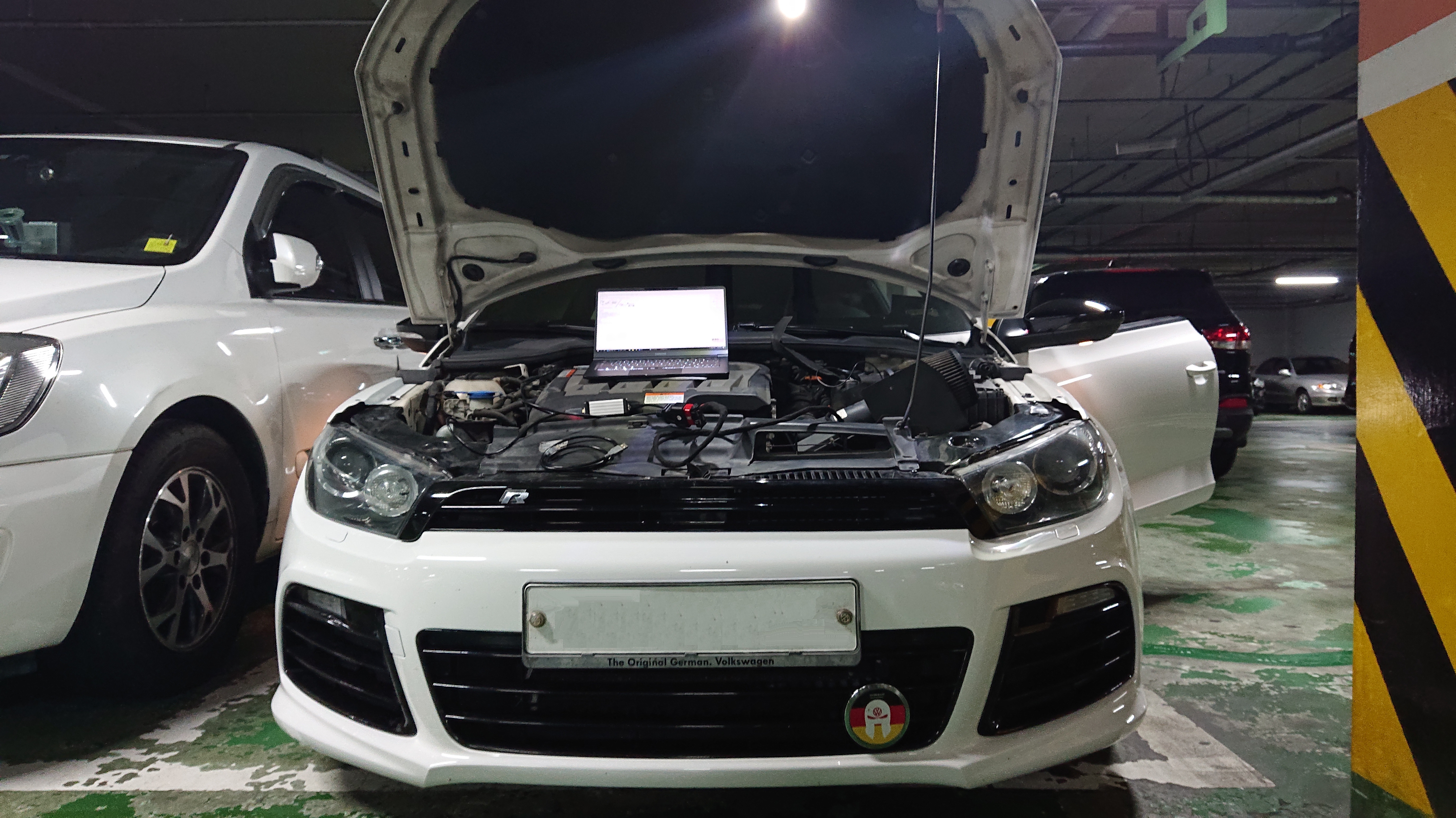 지하주차장에 주차 후 작업 진행을 했습니다. 시로코는 대부분 TCU 순정 데이터 추출하기 위해선 엔진룸에서 DIRECT 연결이 필요합니다. 이 방식으로 순정 데이터 추출하여 해당 버전에 맞는 TCU 데이터를 준비합니다. ECU는 무난하게 차 내에서 OBD 단자로 추출이 가능하구요.