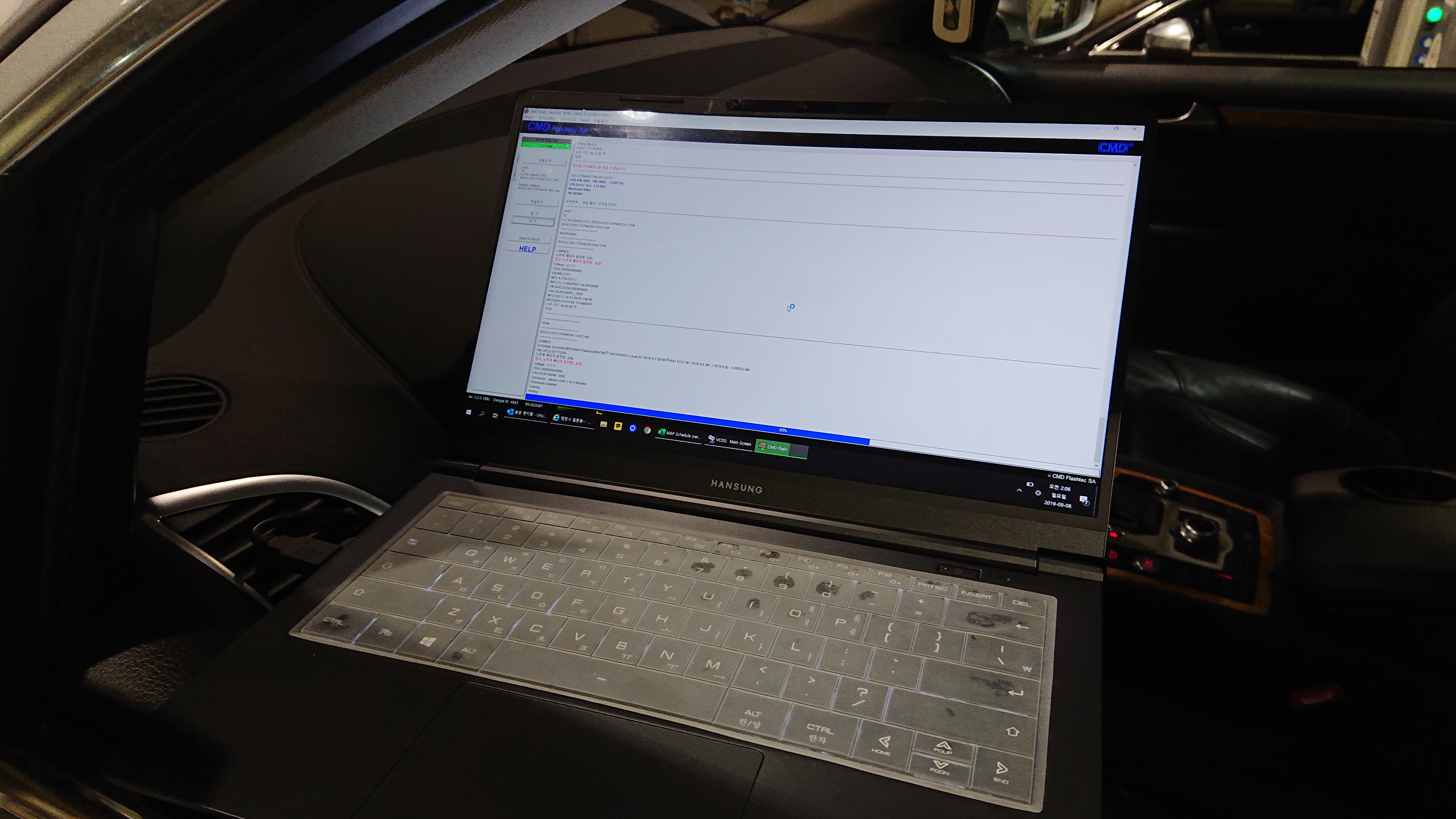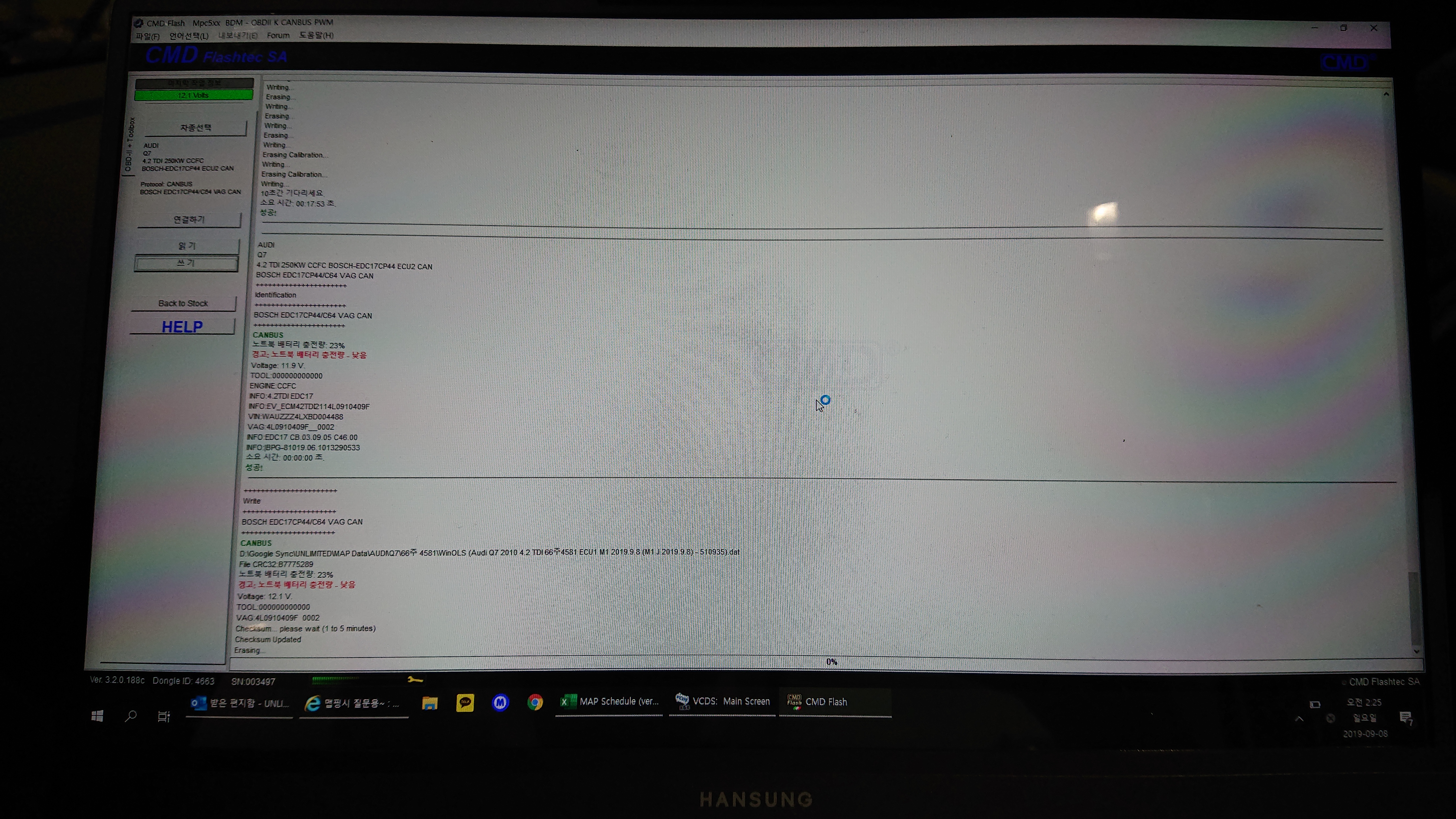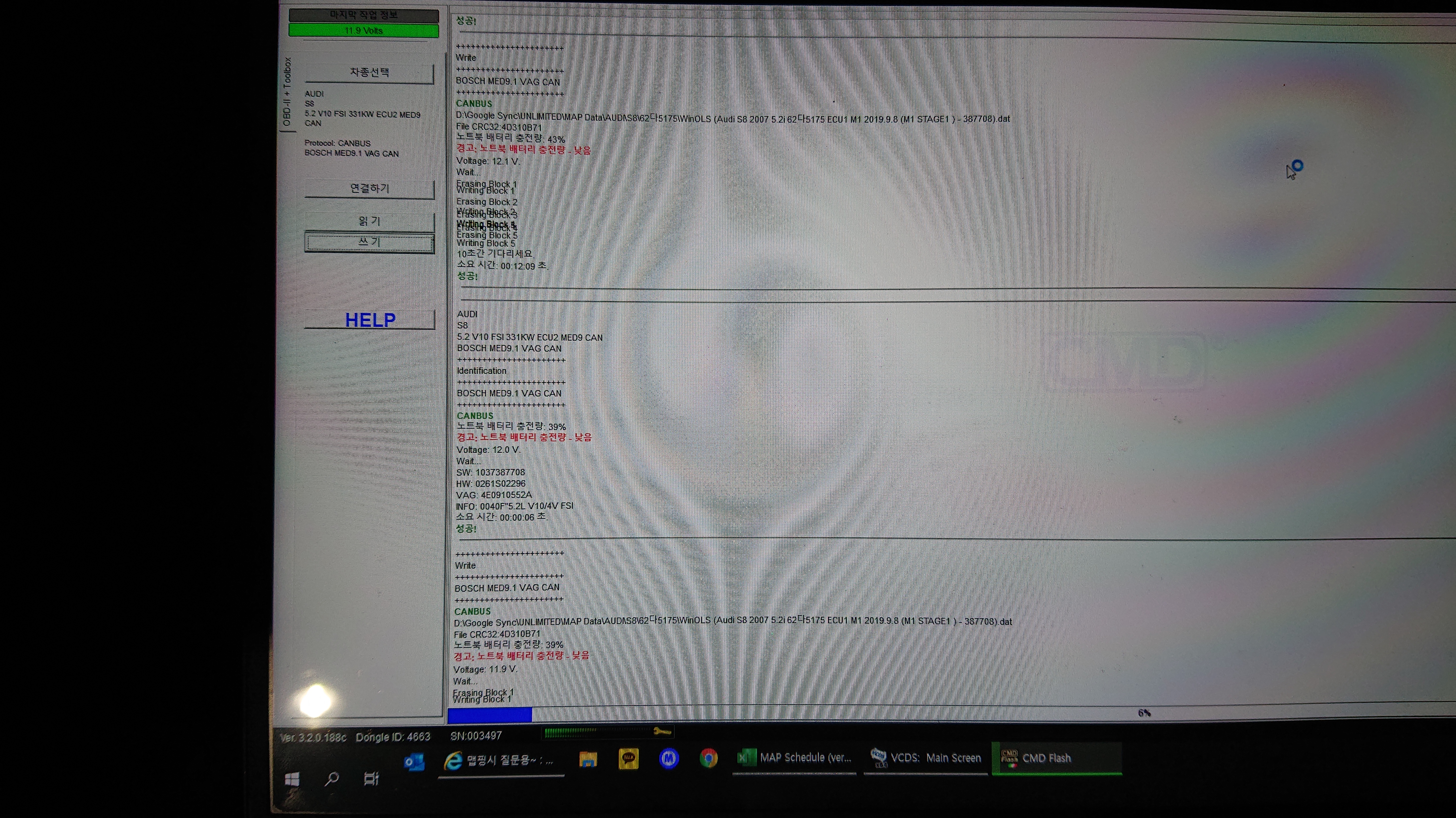 데이터를 추출한 후 주입 작업에 들어갑니다. 방전을 대비해 보조배터리를 연결시키고 진행합니다. 작성된 파일을 두 ECU 모두 넣으려면 상당히 오랜 시간이 소요 됩니다.