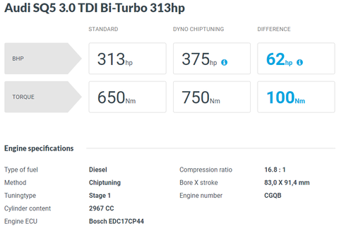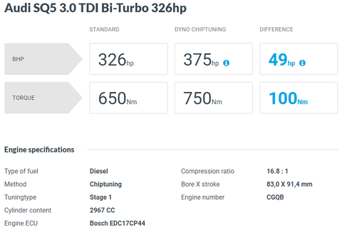 다음은 SQ5 입니다. SQ5의 경우엔 국내에 313마력과 326마력 두 가지 버전으로 판매되었습니다. 역시나 두 엔진의 최종 데이터는 동일하지요. (요소수 들어가는 모델부터는 엔진형식이 CVU로 바뀌는 걸로 알고 있는데, 오류인지 그냥 CGQ형식으로 기재돼 있네요)