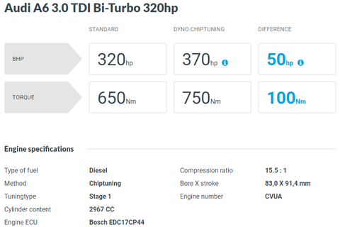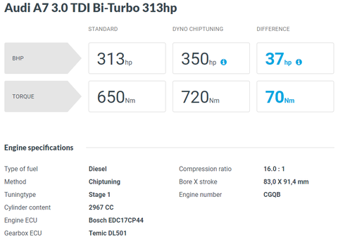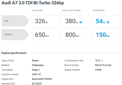다음은 A7 입니다. 여기선 조금 다르게 313마력 데이터와 다른 마력 데이터의 상승치가 조금은 다릅니다. 어쨌건 320, 326마력의 최종 데이터는 유사하지요? A6보다 조금 더 높은 출력으로 기재돼 있습니다. 실제 두 차량의 데이터를 보면 리맵 데이터는 동일한 걸로 표시하고 있습니다.