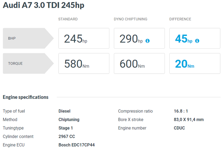차량의 제원은 같지만 45 TDI의 경우엔 기존의 3.0 TDI에서 ECU/TCU 데이터 모두 약간의 개선(Version Up)이 있습니다. 그로 인해 전반적인 데이터는 유사하지만 셋팅은 미세한 차이가 있을 수 있습니다.