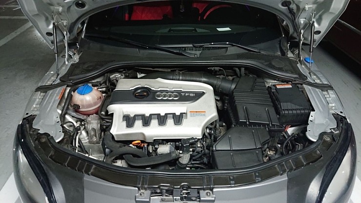 엔진룸의 모습 입니다. 엔진 배열 및 엔진룸 내부는 시로코와 크게 다를 것이 없으나, 아우디 차량의 경우 대부분 배터리가 트렁크에 장착되어 있기에, 시로코R 하고는 흡기 라인이 다릅니다. 시로코R의 경우엔 흡기 필터가 엔진 커버에 장착되어 교체가 상당히 번거롭지만, TTS의 경우에는 더 수월하게 교체가 가능하도록 배치돼 있습니다.