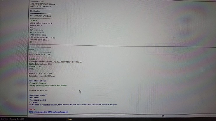 기본 데이터 추출을 하기 위해 장비로 ECU에 접속하여 읽기 과정을 진행했으나, 데이터가 추출되지 않습니다. 경우의 수가 다양합니다. 아우디 차량에 따라 특정 차량은 이와 같이 데이터를 읽을 수 없는 경우도 있으며, 혹은 브랜드 맵 데이터가 주입되어 LOCK이 걸려 있는 경우도 있습니다. 별 수 없이 차주 분과 합의 후 ECU를 추출하여 OPEN 후 데이터를 읽는 방향으로 진행하기로 합니다.