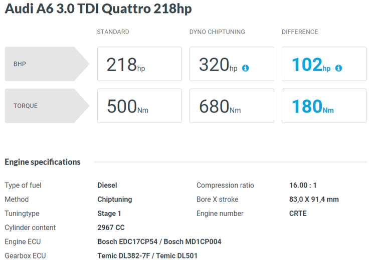 기본적으로 저희가 맵 데이터를 공급받는 Dyno-Chiptuningfiles에서의 두 트림에 대한 제원을 보겠습니다.