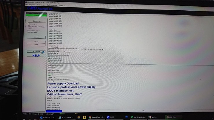 장비와 ECU를 벤치 방식으로 연결하고 다시 한 번 데이터 추출 및 언락 작업을 진행합니다.