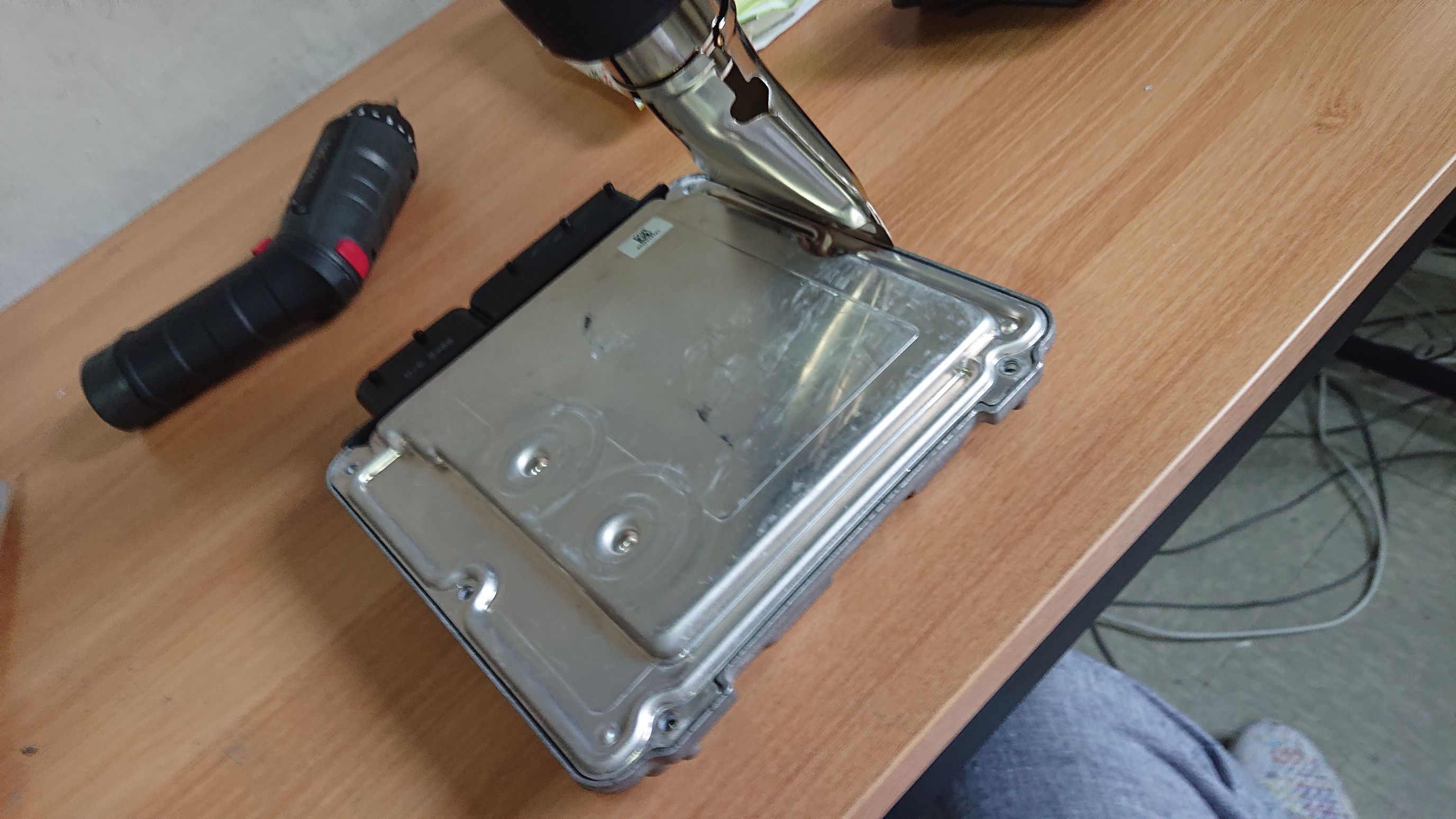열로 지지면서 찍느라 초점이 잘 안맞았네요. 이런 식으로 히팅건으로 네 부분을 자알~~~~ 달궈줍니다.(사실 어마어마하게 뜨겁습니다. 히팅건 온도가 450도 이상인지라... 달군 이후엔 손으로 ECU는 잡을 수가 없어요 ㅠㅠ) 그리고 자알~~~ 열어봅니다.